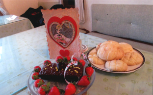 | <英国ヨーロッパの簡単お菓子と料理の旅> 左:チョコレートテリーヌ 右:メロンパン 食パンを材料の一部に使いました。 | 右:メロンパン =底は食パンで上のカバーはホットケーキミックスを使いました。 格子模様をつけ、グラニュー糖をふるって焼きます。 |