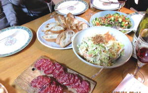 | <チーズのある食卓> サラミ2種:ヴォーフォール入り(右) ヘーゼルナッツ入り(左) 右手ワインはプルゴーニュ産 |