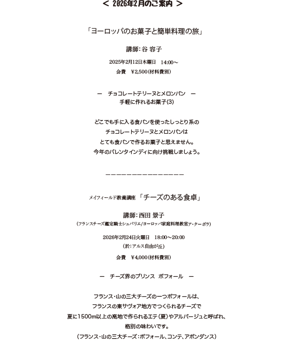 新しい年いかがお迎えですか。今年は心安まる良い年になりますよう祈りたいですね。さて一月の薬膳クラスは元気で春が迎えられるよう、 春節(中国の正月)のお料理で冬対策をします。ヨーロッパと英国簡単料理とお菓子の旅では家庭でのおやつ作りの頼もしい味方、 お菓子に必要な材料がバランスよく配合されているホットケーキミックスを使用し、 フランスの子供が一番に習うと言われるチーズケーキと、柚子の香りが豊かなマドレーヌを作ります。 簡単です!又年が明けるとお祝い事が多いですね。 製本の望月講師オリジナルのブックカバー、御朱印帳はご好評いただいていますが、春のプライスダウンセールをしていますので ご自分やプレゼントにいかがでしょうか。リサイクルルームでは冬向きのセーターなど展示しています。ご覧ください。 本年もどうぞよろしくお願い致します。 (メイフィールドのTEL/FAXが、03-5726-8633に変わります。お急ぎの方は携帯までお願いします。)