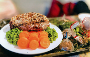 マスタード、パン粉をまぶした豚肉とグラッセした ニンジン、グリンピースが付け合わせ。 |